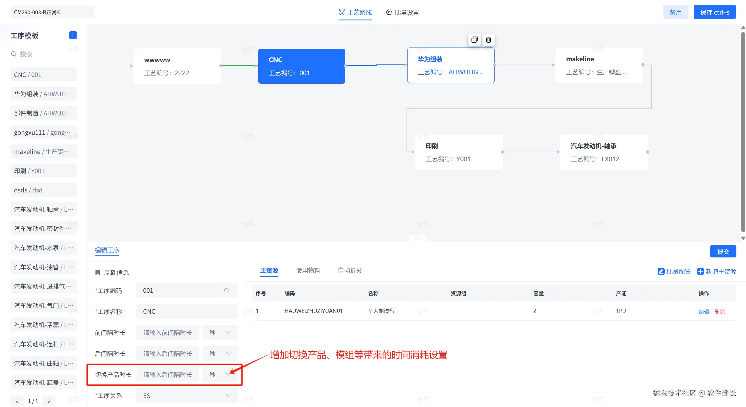 2、在实际的排产过程中,如果相同设备造不同产品时,工序增加切换产品时长配置,这样可以增加模具切换时的时间消耗可以纳入排程优化考虑的计算。