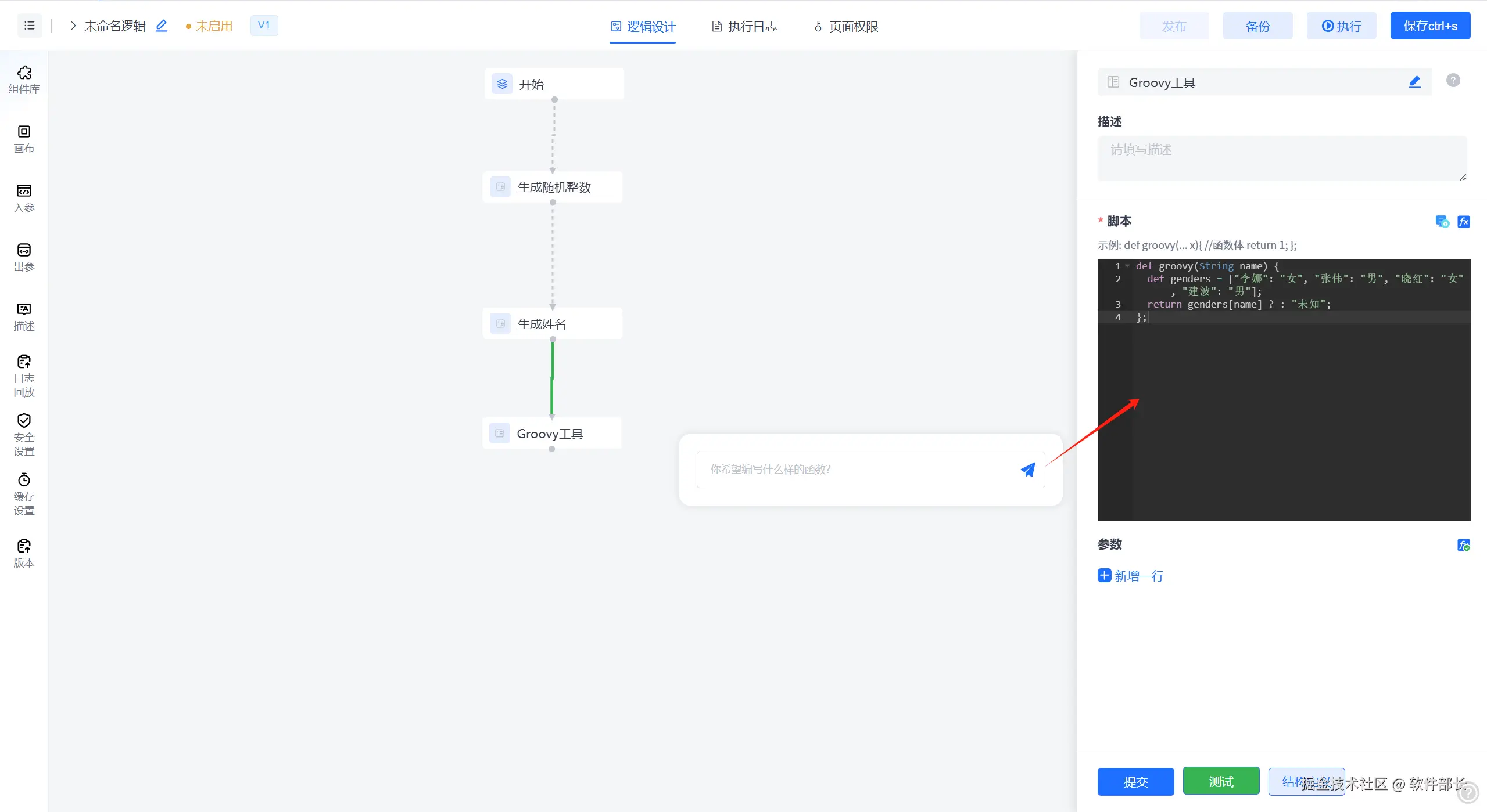 1、新增Groovy智能脚本节点,节点集成自然语言处理引擎,通过语义解析实现AI辅助脚本生成:用户输入功能需求后,系统自动生成符合Groovy语法规范的脚本代码,经语法校验与调试面板确认后,填充至目标字段,支持脚本逻辑的即时测试与二次编辑