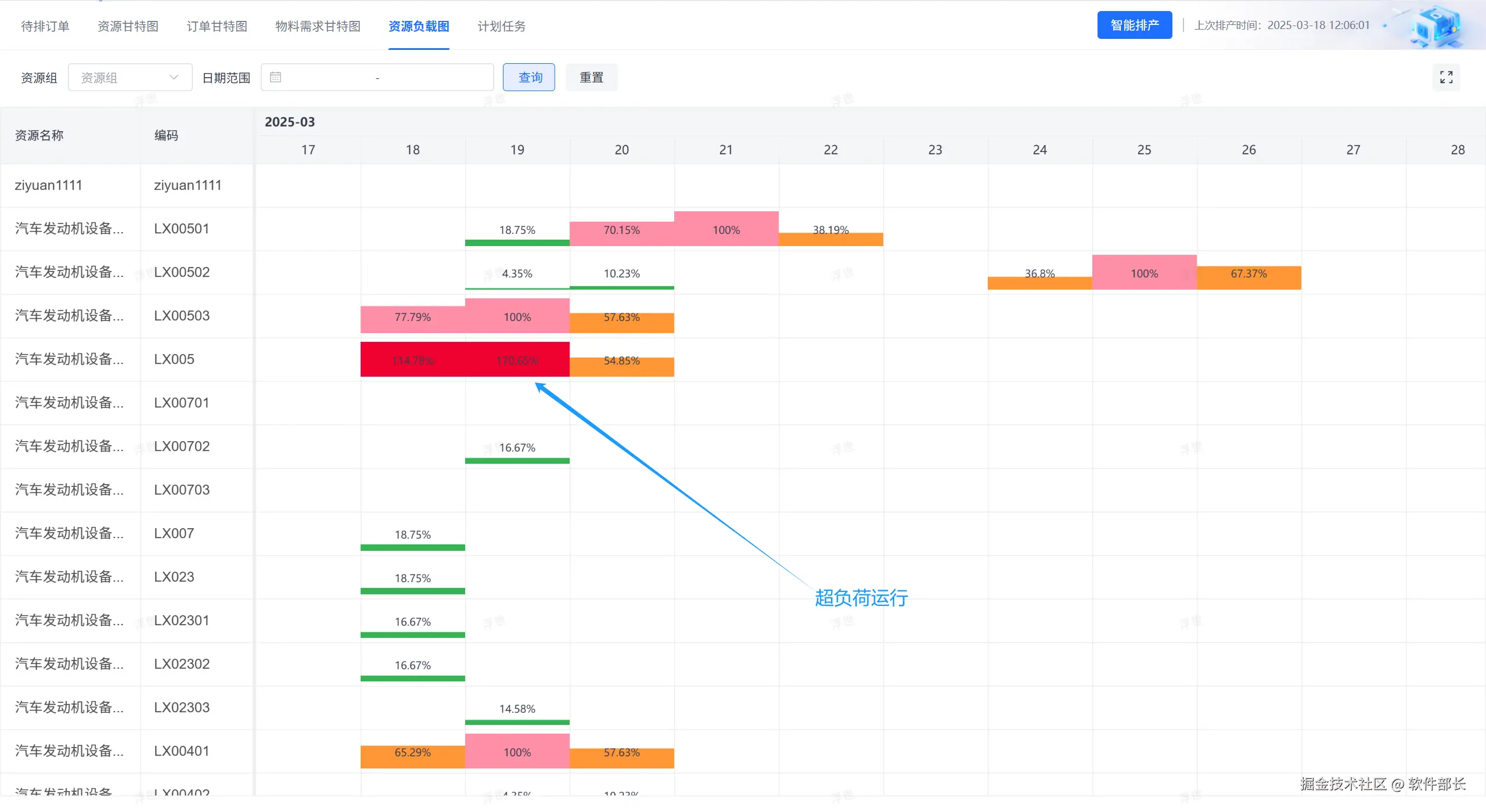 4、资源负载图,支持超负荷状态(负载大于100%),根据标准的产能与实际的产量进行评估计算。