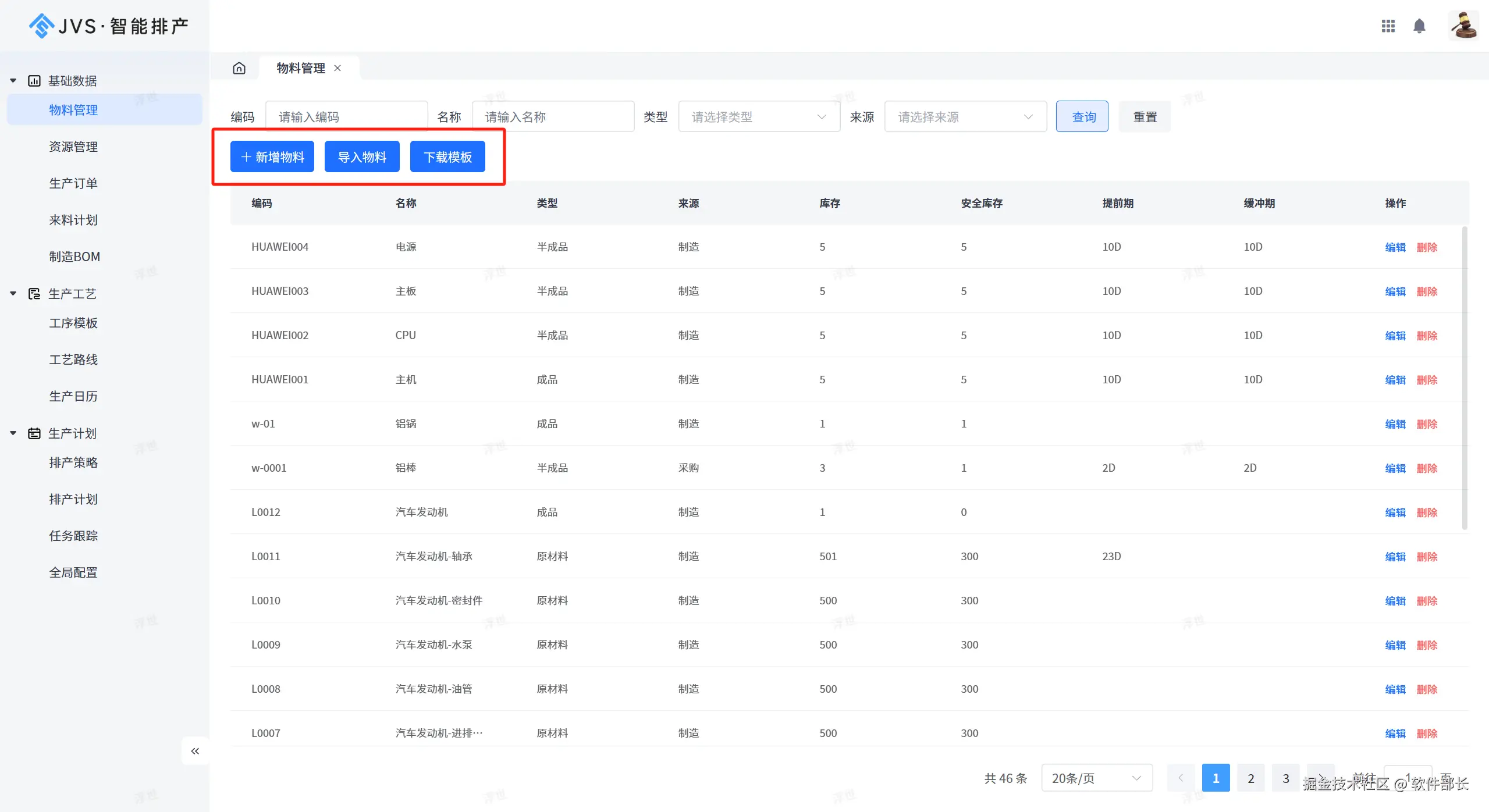 5、提供相应基础数据配置的界面化导入导出功能,支持模板的下载,包括:物料管理、订单管理、来料计划、资源管理等:
