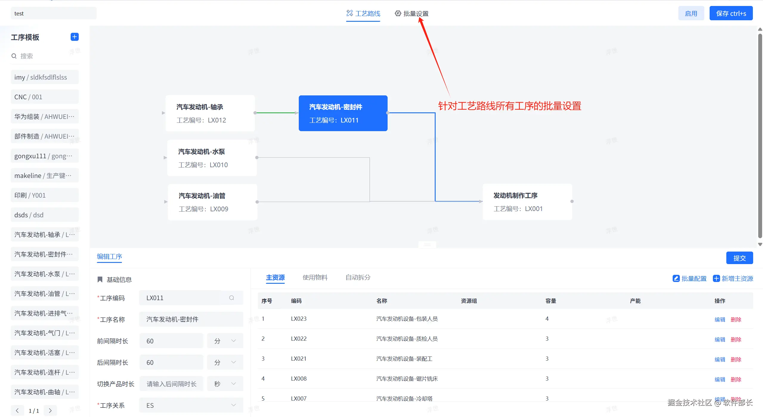 3、为提升配置的效率,在工艺路线中,增加了批量设置的能力,对本路线下的所有工序环节进行统一设置: