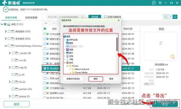 步骤3:选择需要恢复的文件后,点击表示勾选,最后在弹窗中选中文件合适的存放位置,点击“确认”。