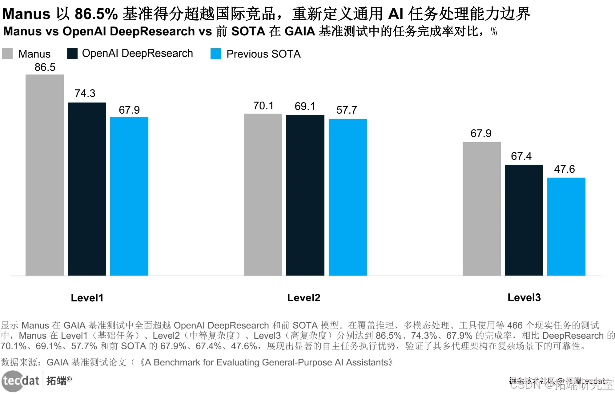 GAIA基准测试数据显示,Manus在推理、多模态处理等466个现实任务中,以86.5%的综合得分超越OpenAI DeepResearch的70.1%,且在高复杂度任务(Level3)中优势显著(67.9% vs 57.7%)。这一突破源于其多重签名验证体系,通过多模型交叉验证降低单模型偏见风险。