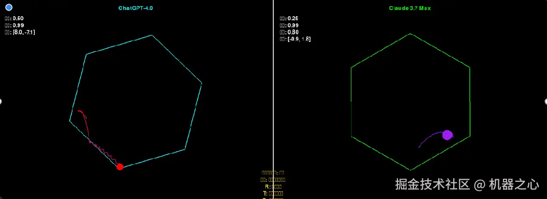 通过观察小球的运动轨迹,可以直观感受到 ChatGPT-4.0 和 Claude Max 对重力和摩擦力模拟的差距,这一对比结果从侧面反映出 Claude Max 在代码编程上有着出色的表现。