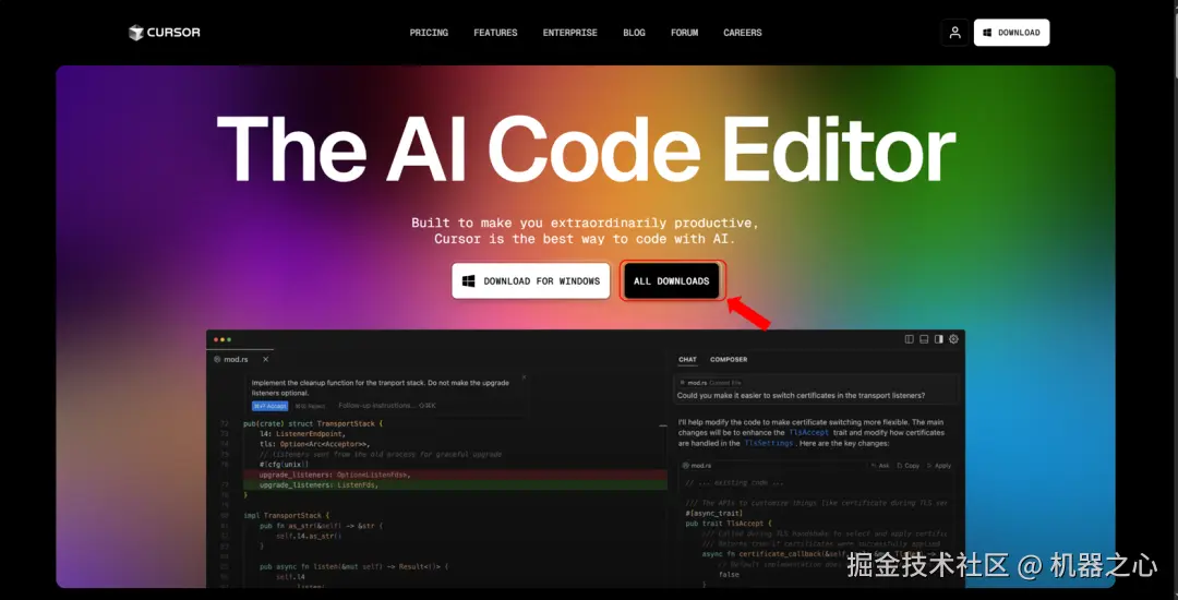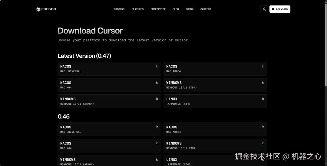 因此这里在安装它的时候需要从 Cursor 官网中的「ALL Downloads」列表中手动查找并下载最新版本,经测试版本为 0.47.8 的 Cursor 支持 Claude 3.7 Max。