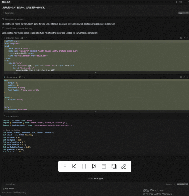 虽然生成过程有点长,但令人意外的是,生成的 3D 模拟赛车游戏具备同时切换多种视角的功能。