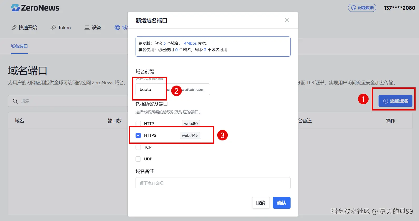 用户登录 ZeroNews 平台,在 "资源" 的 "域名" 管理页面, 点击 "添加域名" 添加公网可访问的域名。