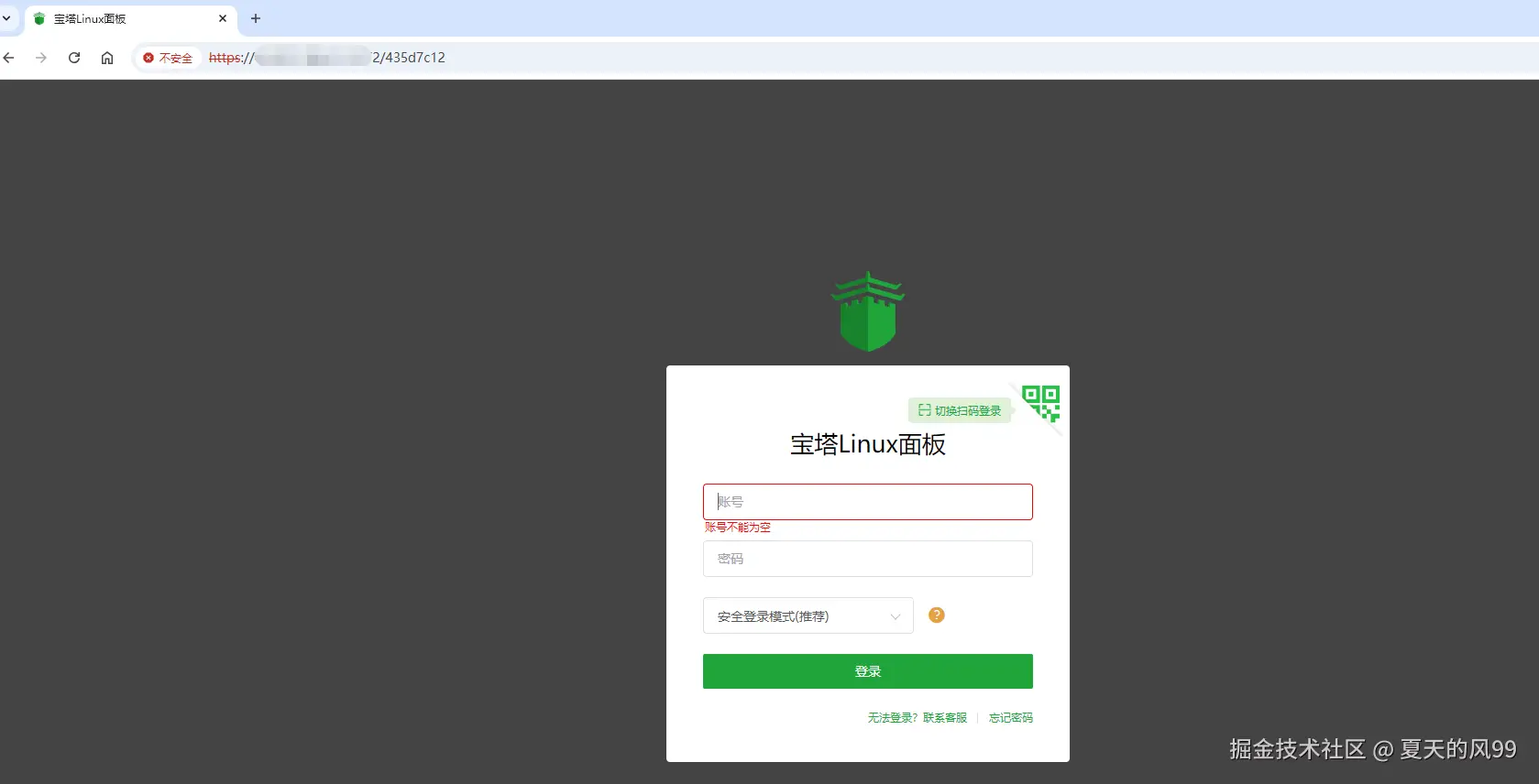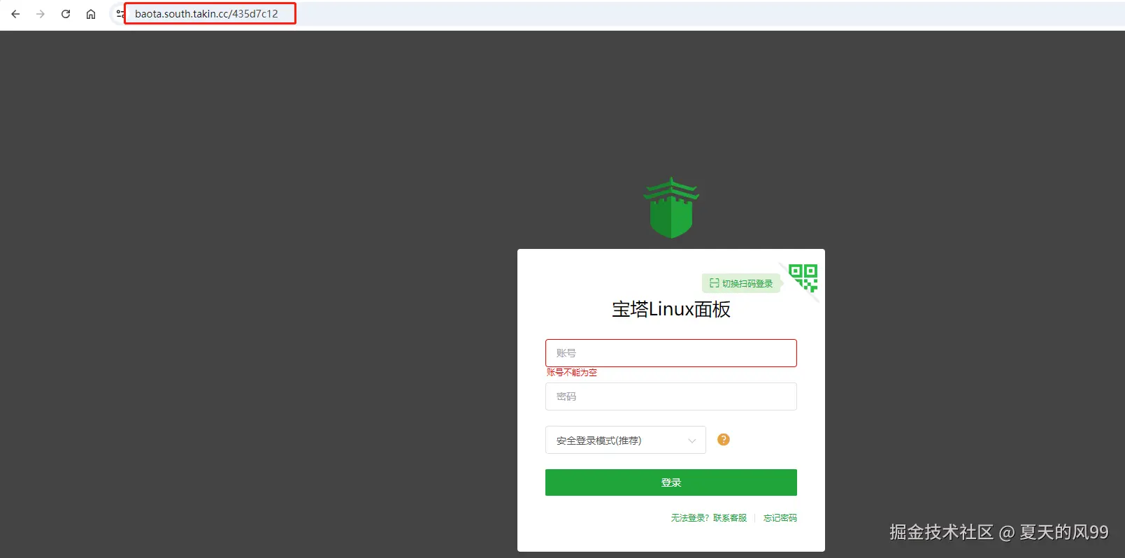 通过ZeroNews 域名访问宝塔面板,浏览器中输入分配给宝塔面板的域名地址,域名后面需要加宝塔面板的路由地址,在安装宝塔面板的时候会显示
