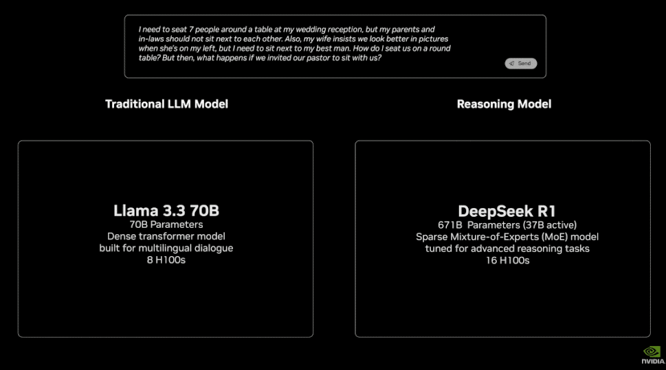 而老黄在现场体现传统 LLM 和推理 LLM 的区别时,也是拿着 DeepSeek-R1 来举例: