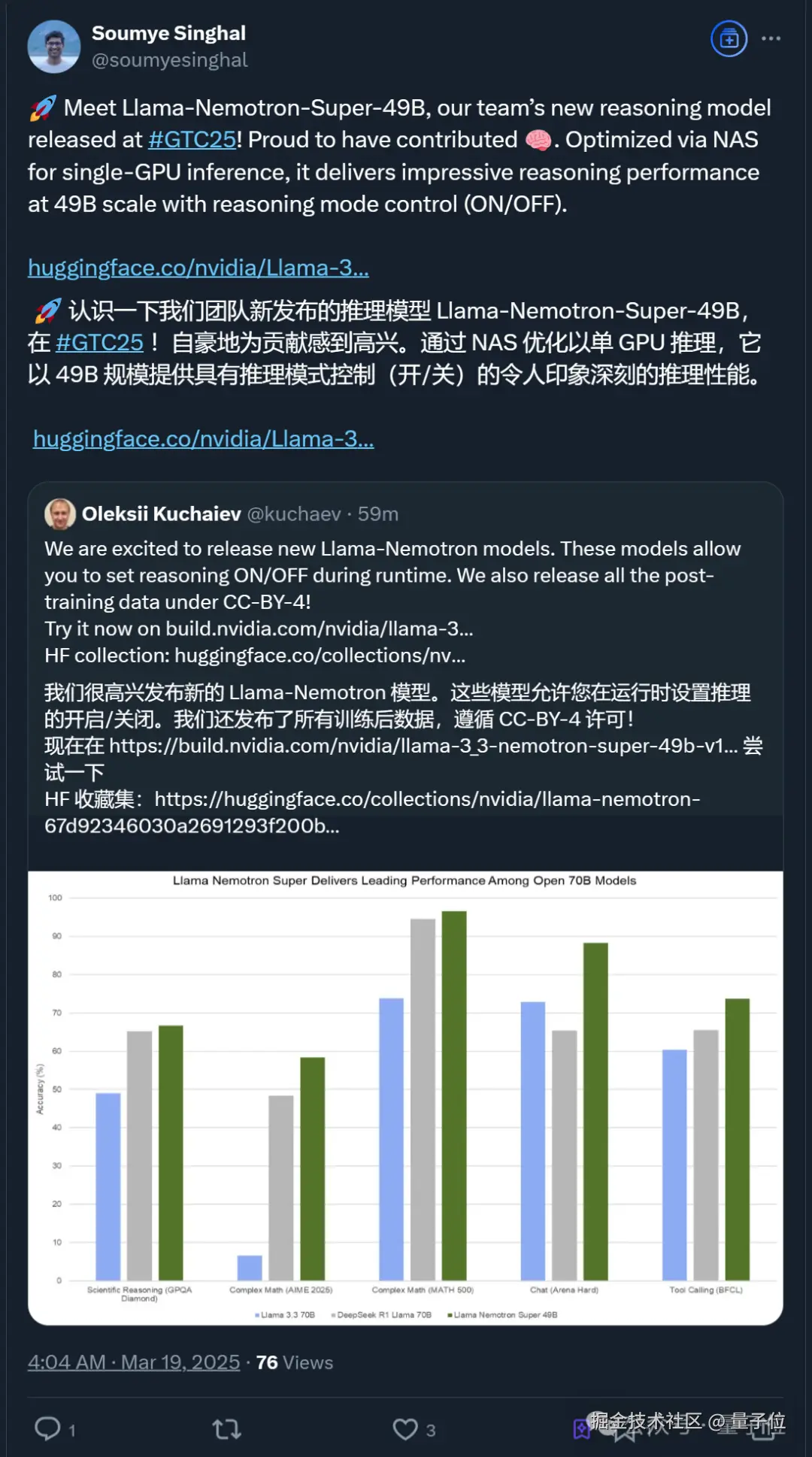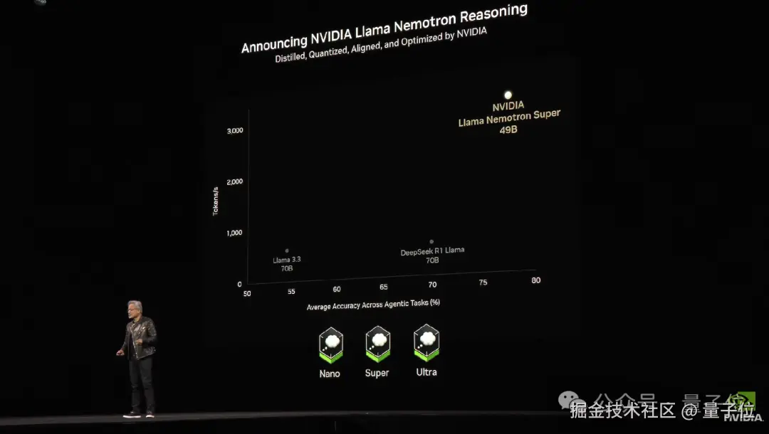 为了直观展示其性能,老黄在大会上将它和 Llama 3.3(70B)以及 DeepSeek R1 Llama (70B)进行了对比,下图展示了它们在 Agentic 任务上的平均准确率(横轴)与每秒处理的 tokens 数量(纵轴):