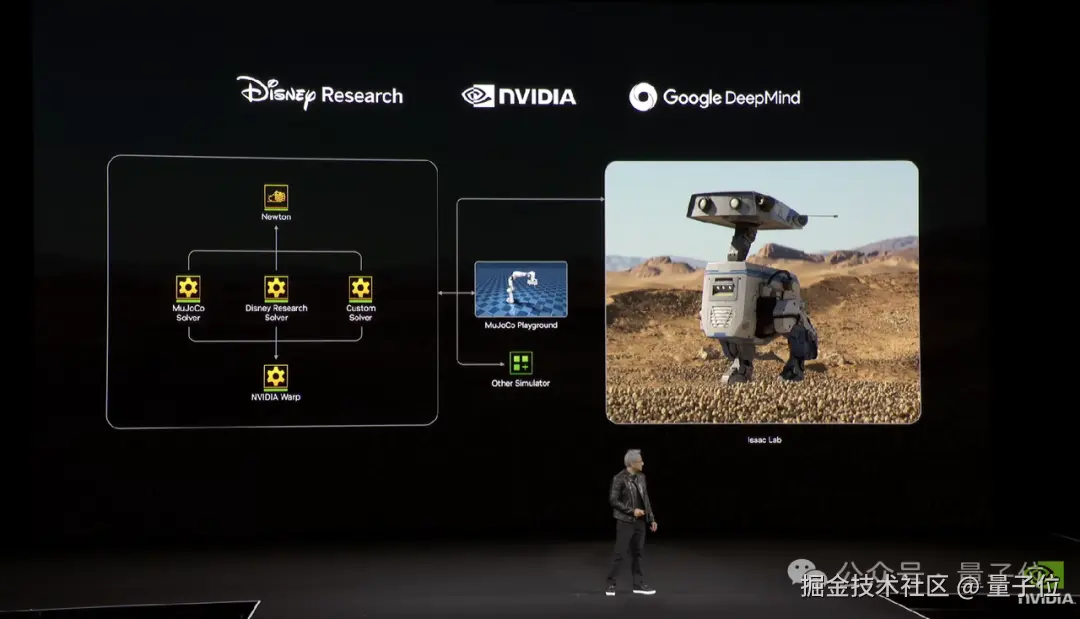 到了大会的最后阶段,老黄宣布英伟达与 Google DeepMind 和 Disney Research 正合作开发下一代开源仿真物理模型 Newton。