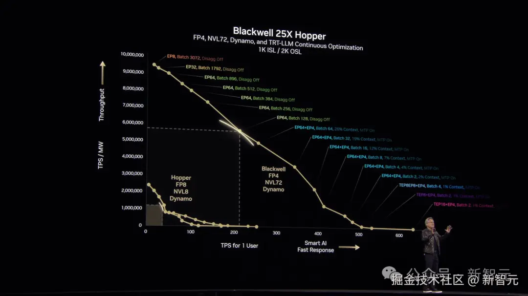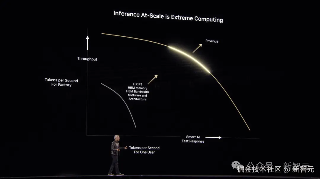 老黄展示这张图中,x 轴代表了生成的 token,y 轴代表着每秒 token 吞吐效率,理想情况下,图中黄色曲线应该是一个方形,即在工厂能力极限之内,非常快速生成 token。