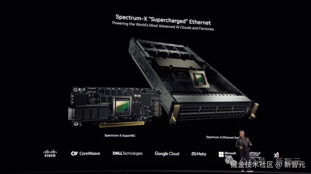 主要是通过网络 InfiniBand 和 Spectrum X。后者具备了低延迟和拥塞控制特性,并且成功 scale up 有史以来最大的单 GPU 集群。