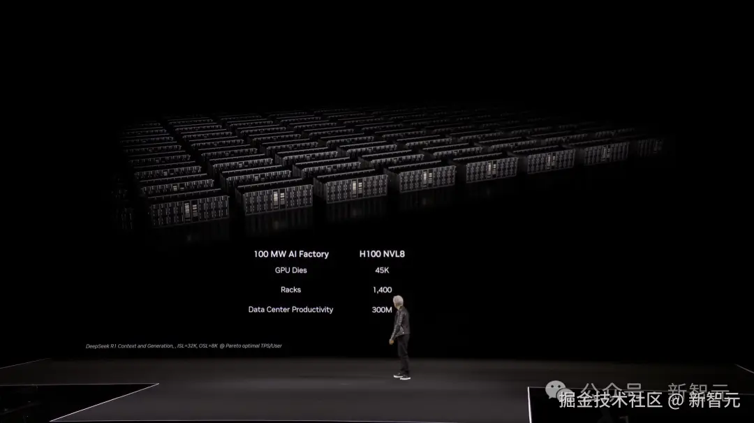 接着,他拿出一个具体的例子来对比:一个 100 兆瓦的 AI 工厂用 Hopper 技术需要 45000 个芯片、1400 个机架,每秒能产出 3 亿个 token。