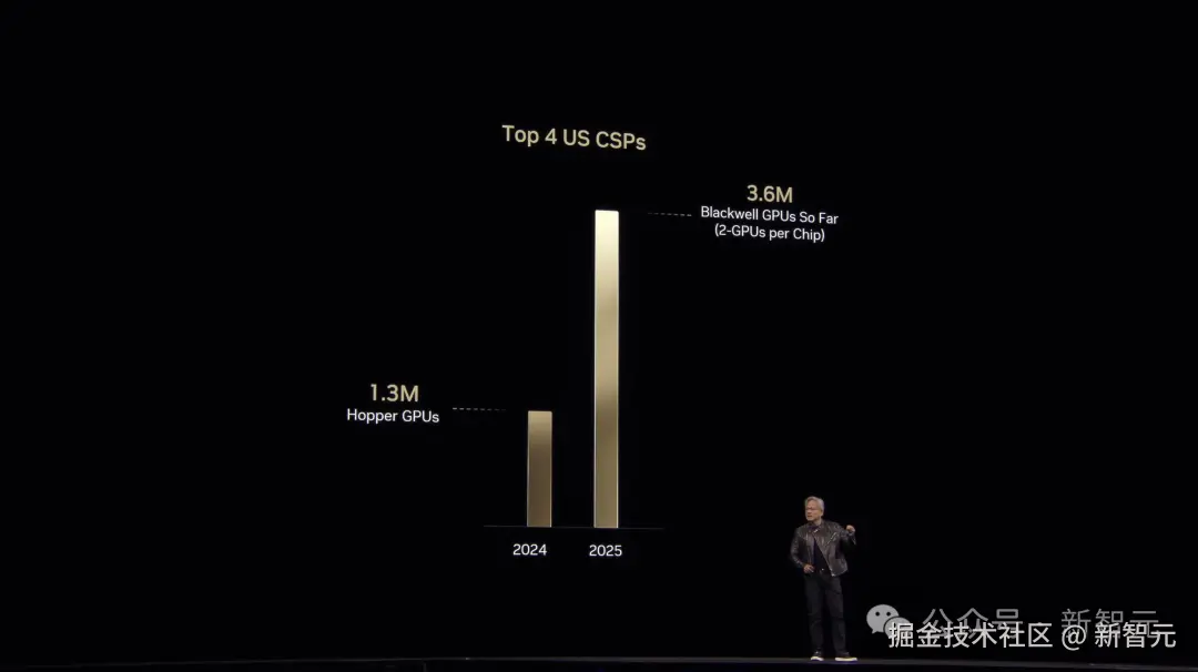 Blackwell 发货才一年,我们就见证了全球 AI 基础设施的惊人增长。仅在 2024 年,全球 TOP 4 的云服务商买进的 Hopper 架构芯片就达到 130 万块。