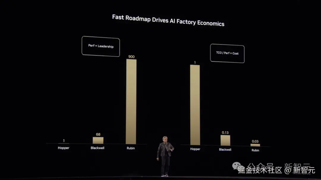 可以看到浮点运算能力,Hopper 架构是 1 倍提升,Blackwell 68 倍提升,到了 Rubin 直接跃升至 900 倍。