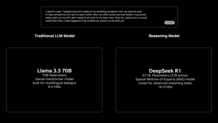 现场,老黄展示了一个传统大模型和推理模型,基于同一段提示通过思考 token 解决问题的关键区别。