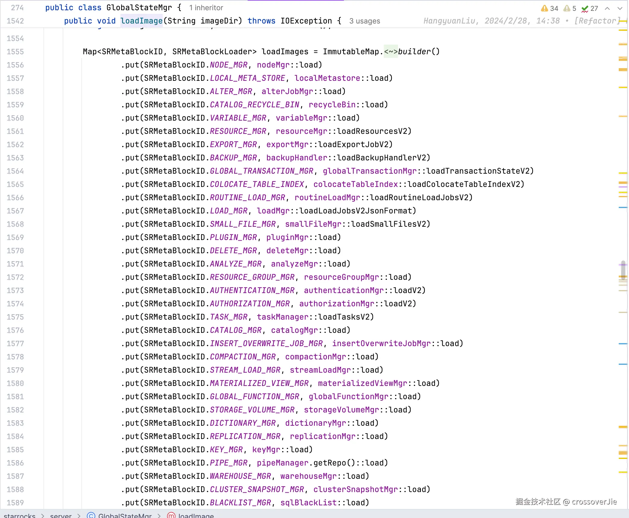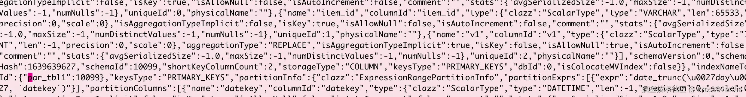 里面是用 JSON 存储的各种类型的元数据,FE 在启动的时候会读取该文件,然后根据不同的类型取不同的偏移量读取其中的元数据加载到内存里。