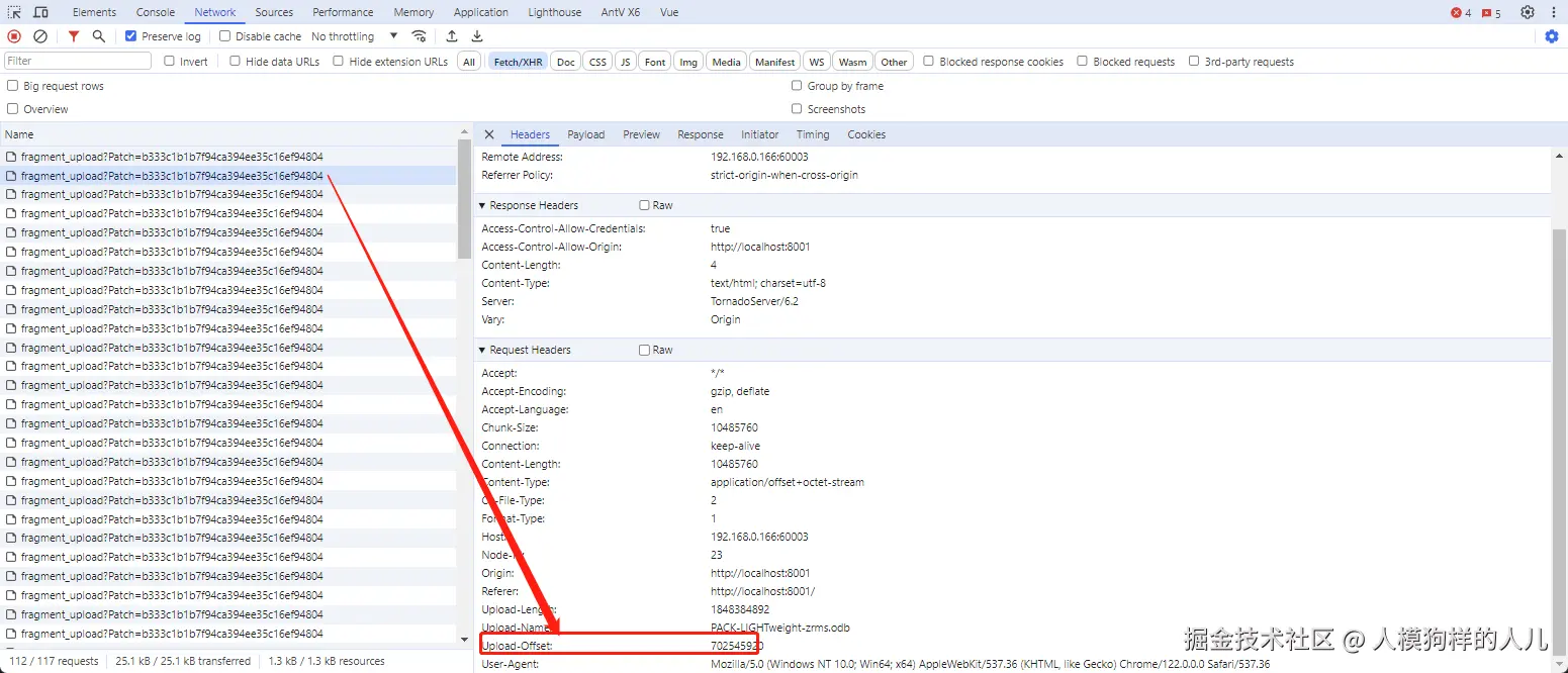 - FilePond 通过一个携带 unique id 12345 的 PATCH 请求,开始上传第一个切片!所有切片上传的 PATCH 请求,都会在请求头中携带 Upload-Offset、Upload-Length、Upload-Name