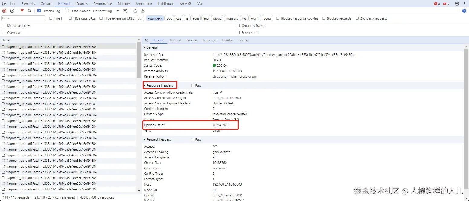 - FilePond 将通过发送一个 HEAD 请求,获取哪些切片已经被上传,并期望从 响应头 中的 Upload-Offset 中,获取到下一个切片的文件偏移量