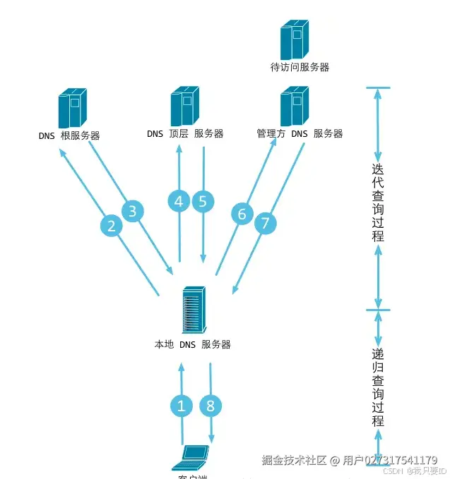 客户端(下级服务器)发起一个DNS解析请求后,若上级DNS服务器并不能直接提供该DNS的解析结果,则该上级DNS服务器会告知客户端(下级服务器)另一个可能查询到该DNS解析结果的DNS服务器IP,客户端(下级服务器)再次向这个DNS服务器发起解析请求,如此类推,直到查询到对应的结果为止。