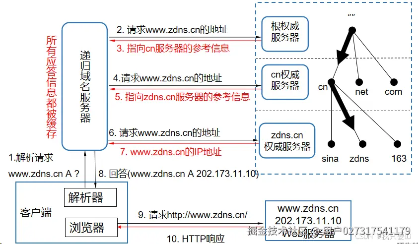 如上图所示,详细阐述 DNS 解析流程:
