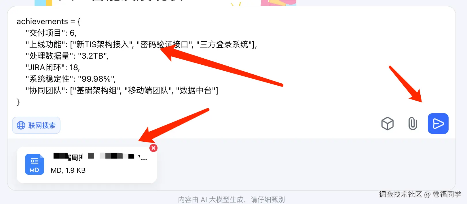 2.接着把提示词发给Deepseek,并上传工作日志内容的附件,可以是PDF或者其他文本格式,内容生成完成后,复制markdown数据