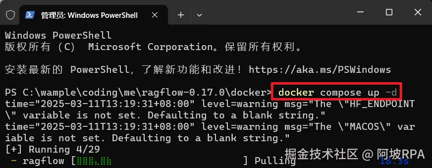 只需要点击启动按钮即可等待服务启动完成,配置我已经调好了,不会和已经安装的dify冲突,不用担心启动后ragflow会对dify造成影响,获取方式在文末