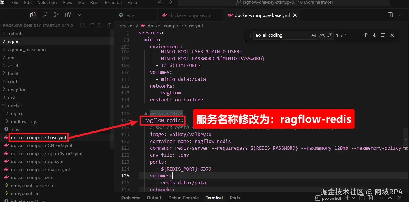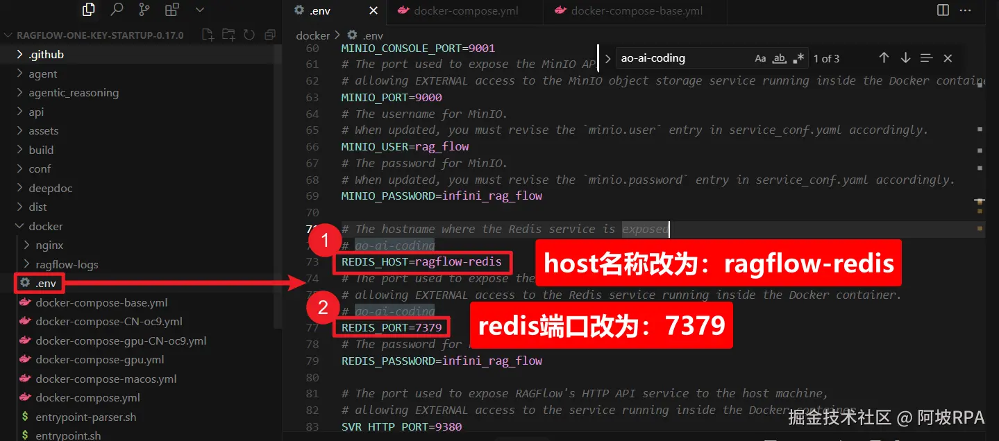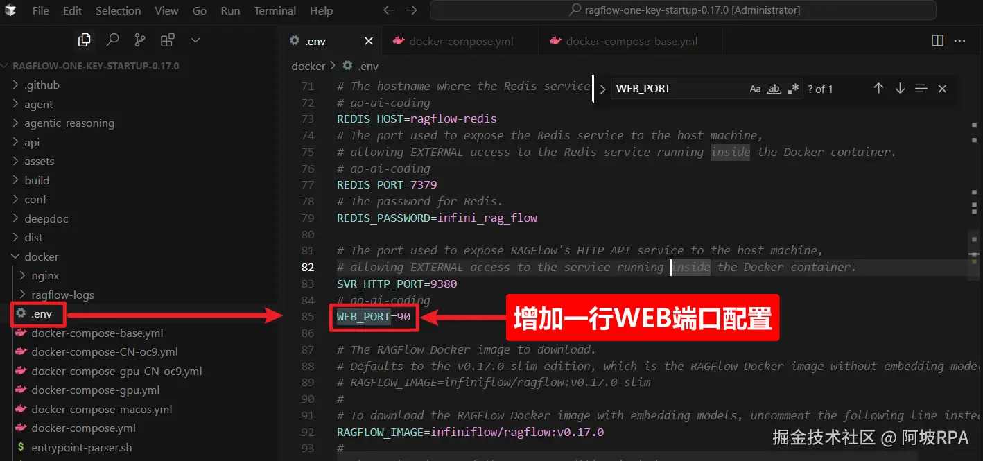 由于前面我们已经安装了Dify项目,这两个项目都依赖了redis,且web端的端口都是默认80端口,因此,为了避免冲突,我们需要修改配置文件。
