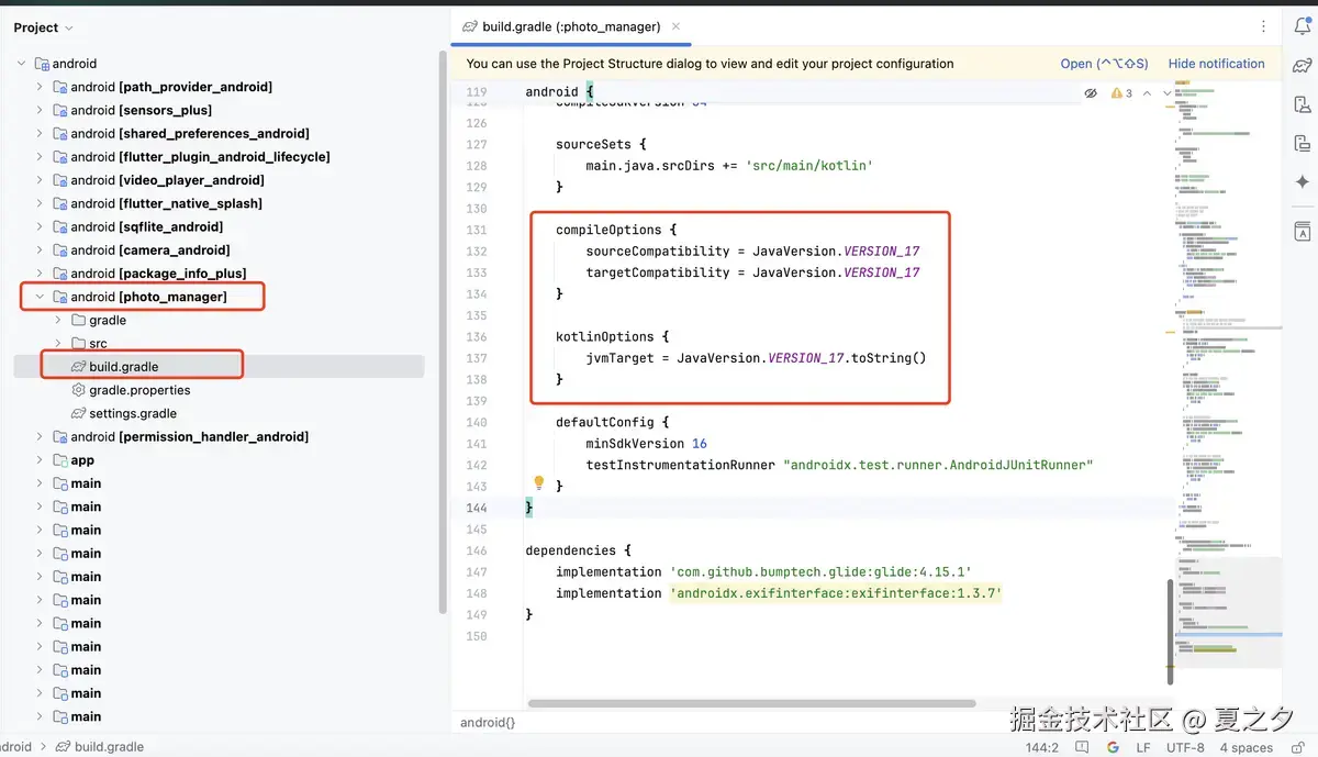 3.首次打开,需要下载一些脚本和库,需要等待编译完成,编译完成之后找到‘photo_manager’这个库,修改根目录下build.gradle文件,将compileOptions和kotlinOptions内的Java版本,修改为app模块‘build.gradle’的Java版本,如图: