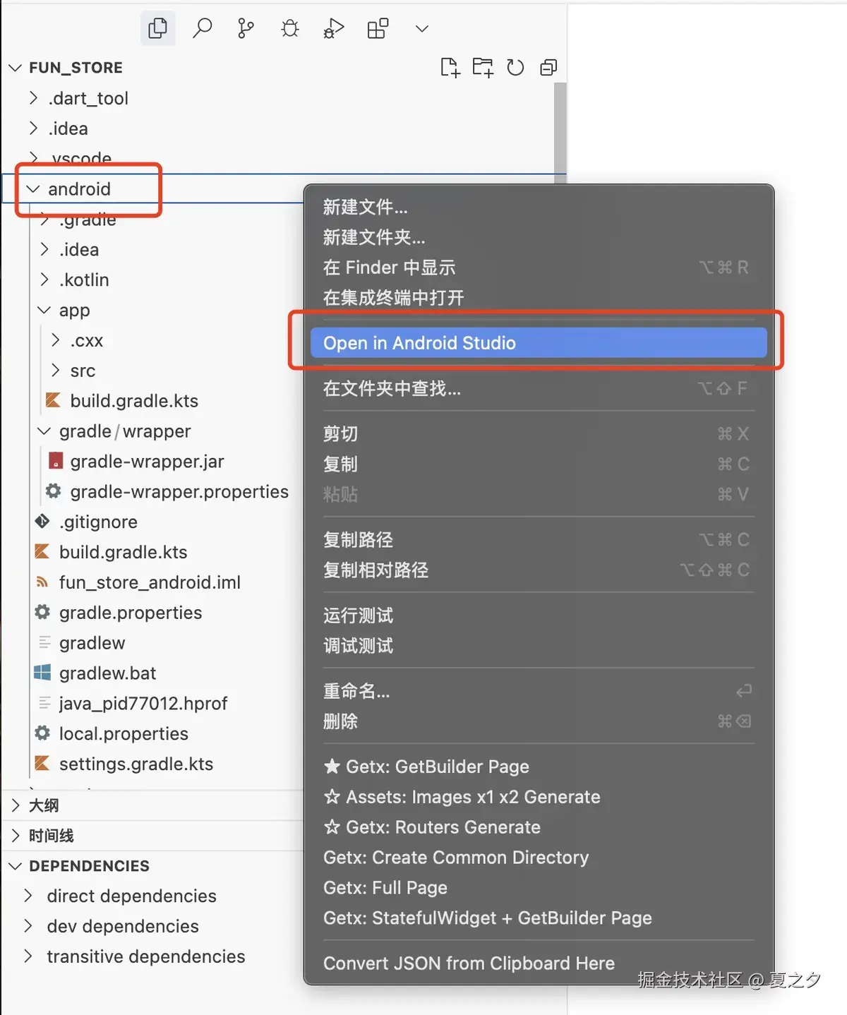 2.在Flutter项目中找到android这个包,右键open in AndroidStudio,如图: