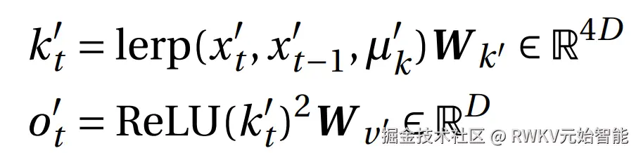 移除 RWKV-6 的 Receptance Gating ( 门控矩阵 ),改为普通双层 ReLU^2 MLP,减少了计算复杂度: