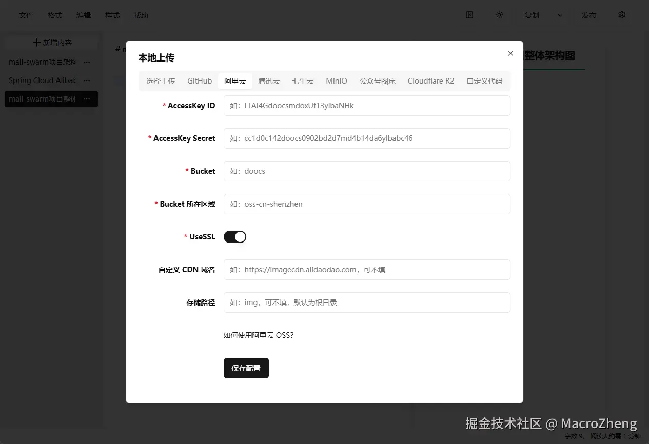 - 支持多图上传功能,可自定义配置图床,如阿里云、腾讯云、MinIO等