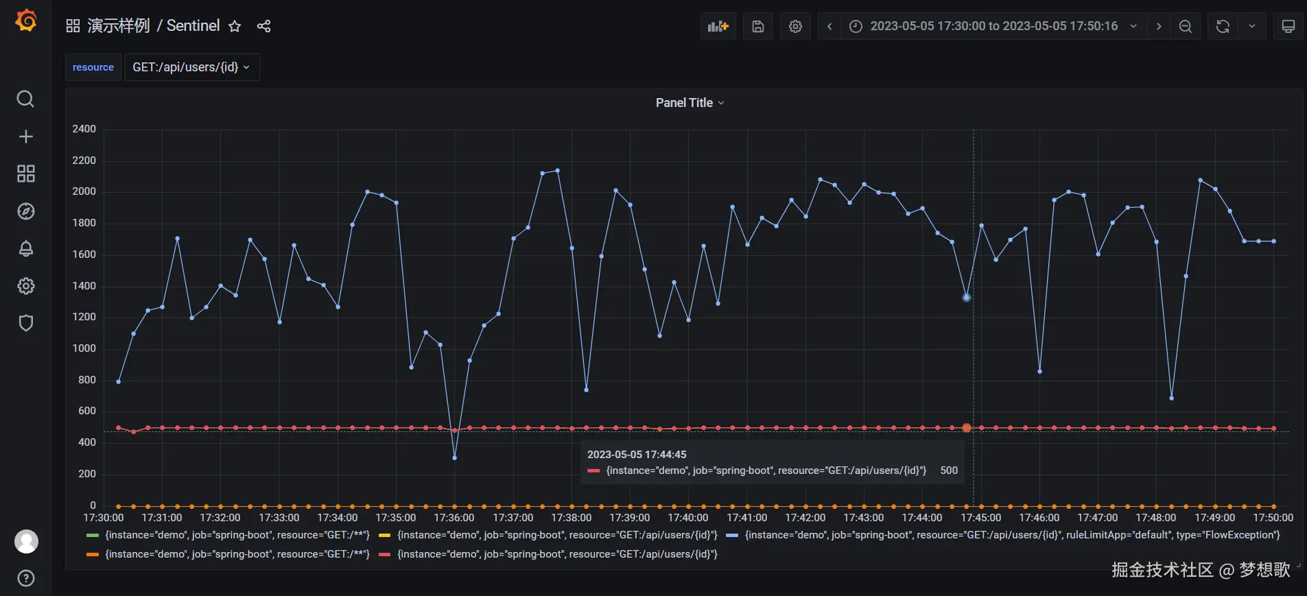 由于 Sentinel Dashboard 开源版本没有实现监控数据的持久化,只能查看 5 分钟的内存数据。在项目初期,我们没有足够的精力对 Sentinel 进行改造,因此,将 Sentinel 的监控数据集成到 Prometheus,并导入到 Grafana 可视化管理。