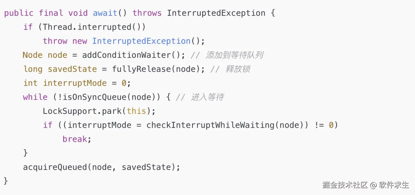 - 进入 Condition 的等待队列,挂起自己(阻塞)。