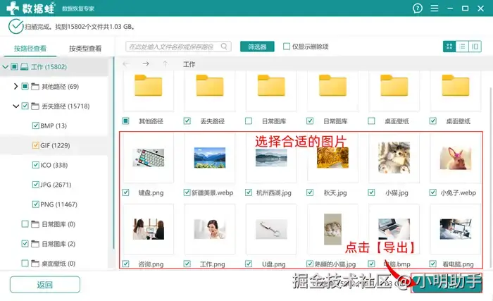 步骤2:扫描结束后,在软件的扫描文件列表中点击需要恢复的文件,选好后点击【导出】;