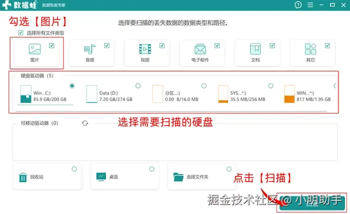 步骤1:打开这款软件,在软件的主页面上方可以选择需要恢复的文件类型(勾选合适的类型),然后在右下角勾选需要进行扫描的电脑位置,选好后点击【扫描】的按钮;