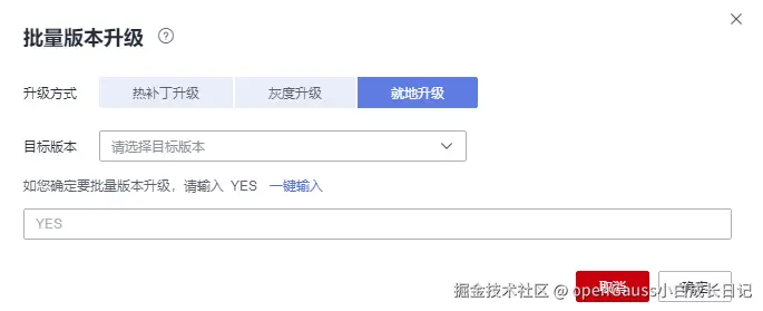 在“批量版本升级”界面,单击“就地升级”,选择需要升级的“目标版本”,输入“YES”,单击“确定”,确认升级。
