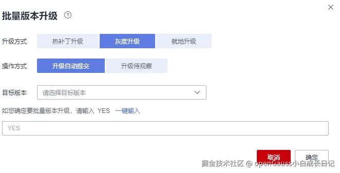 选择“升级可用区”和“目标版本”,输入“YES”,单击“确定”,确认升级。