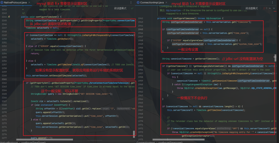 为什么 5.1.45 版本没有这个问题呢?从源码可以看出,5.1.x 版本,不显示设置时区,代码逻辑会直接绕过设置。