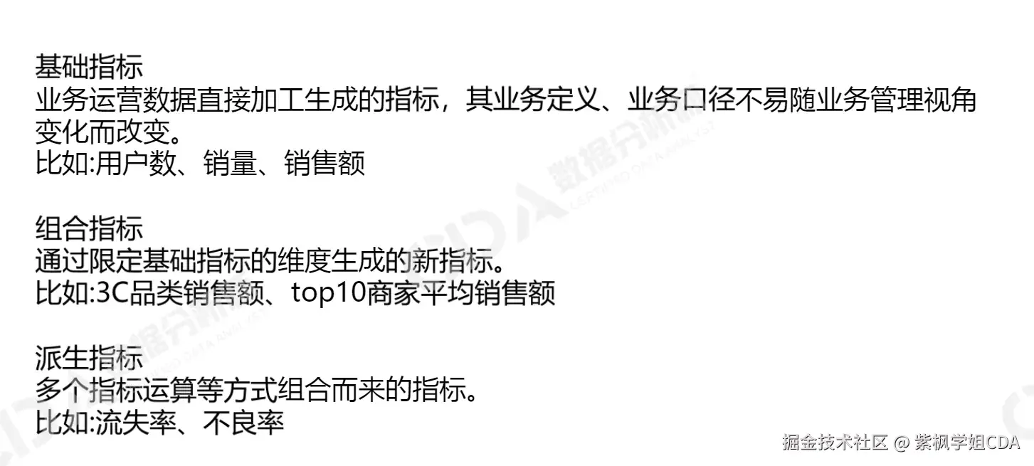 - 基础指标:业务运营数据直接加工生成的指标,如用户数、销售额。