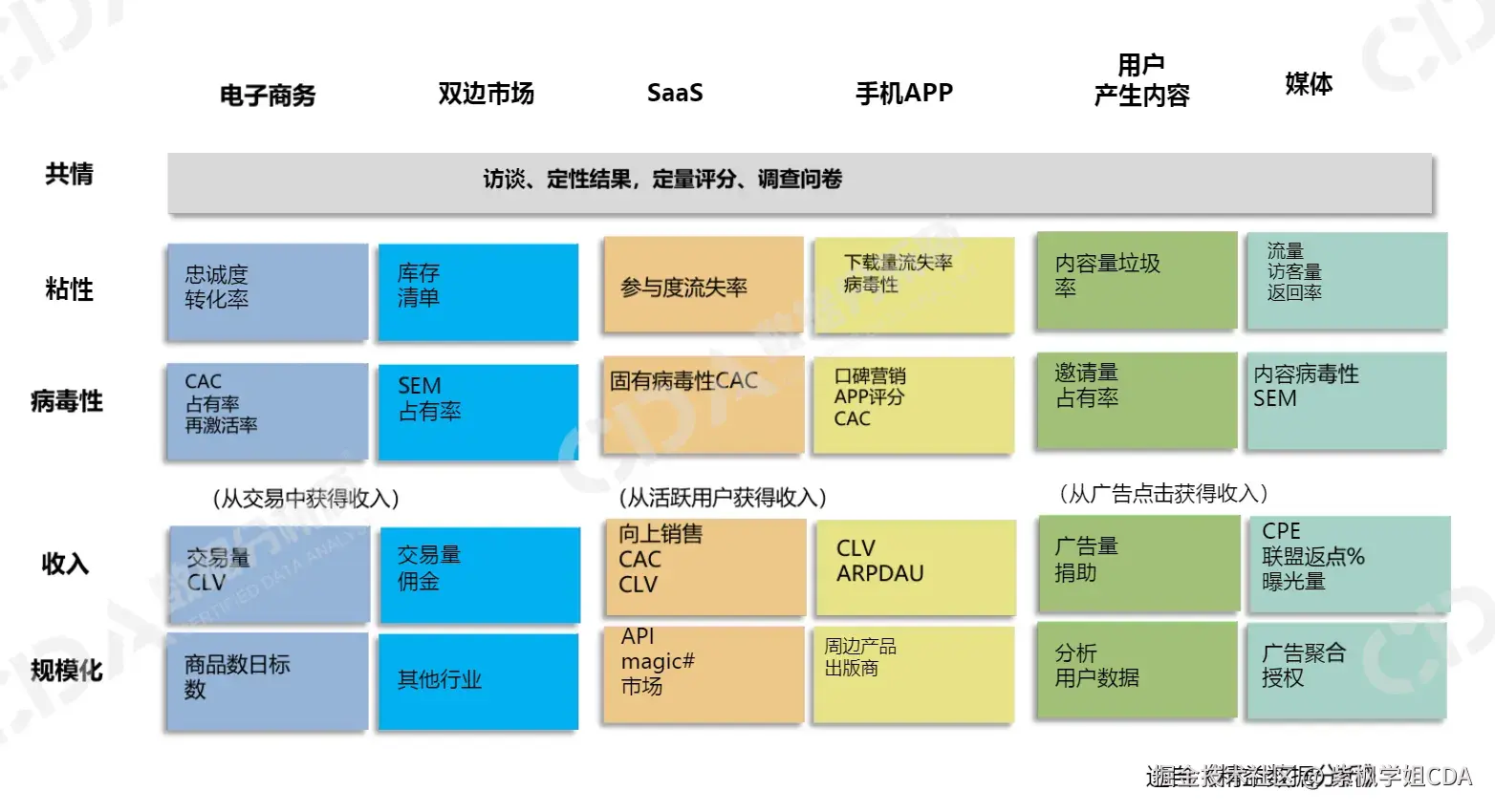 - 客户分析:如增长黑客模型中的获客成本、客户留存率、客户生命周期价值等。