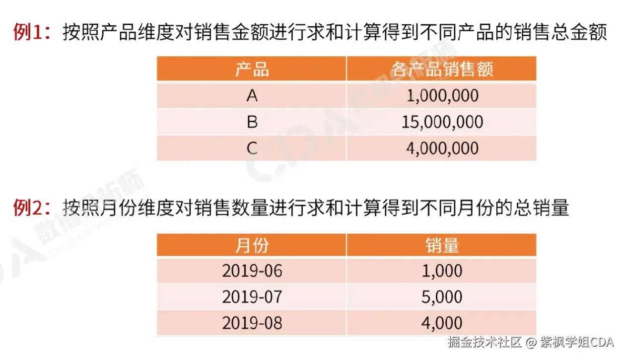 - 常规求和:对度量求和,例如按产品维度计算销售总金额。
