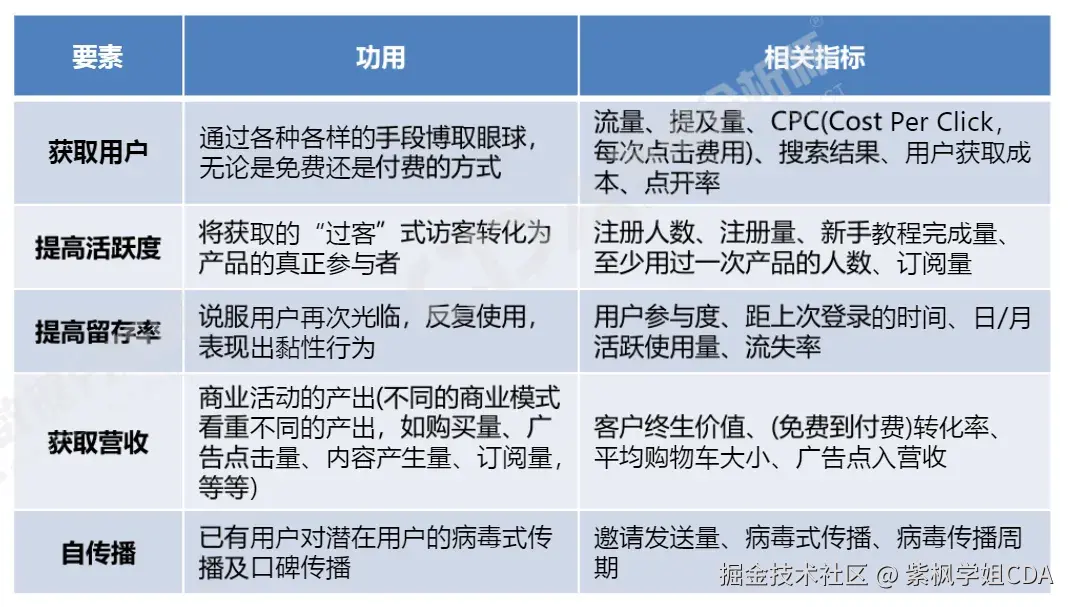 - 度量(Measurement):建立度量体系,如新用户数量、留存率等。