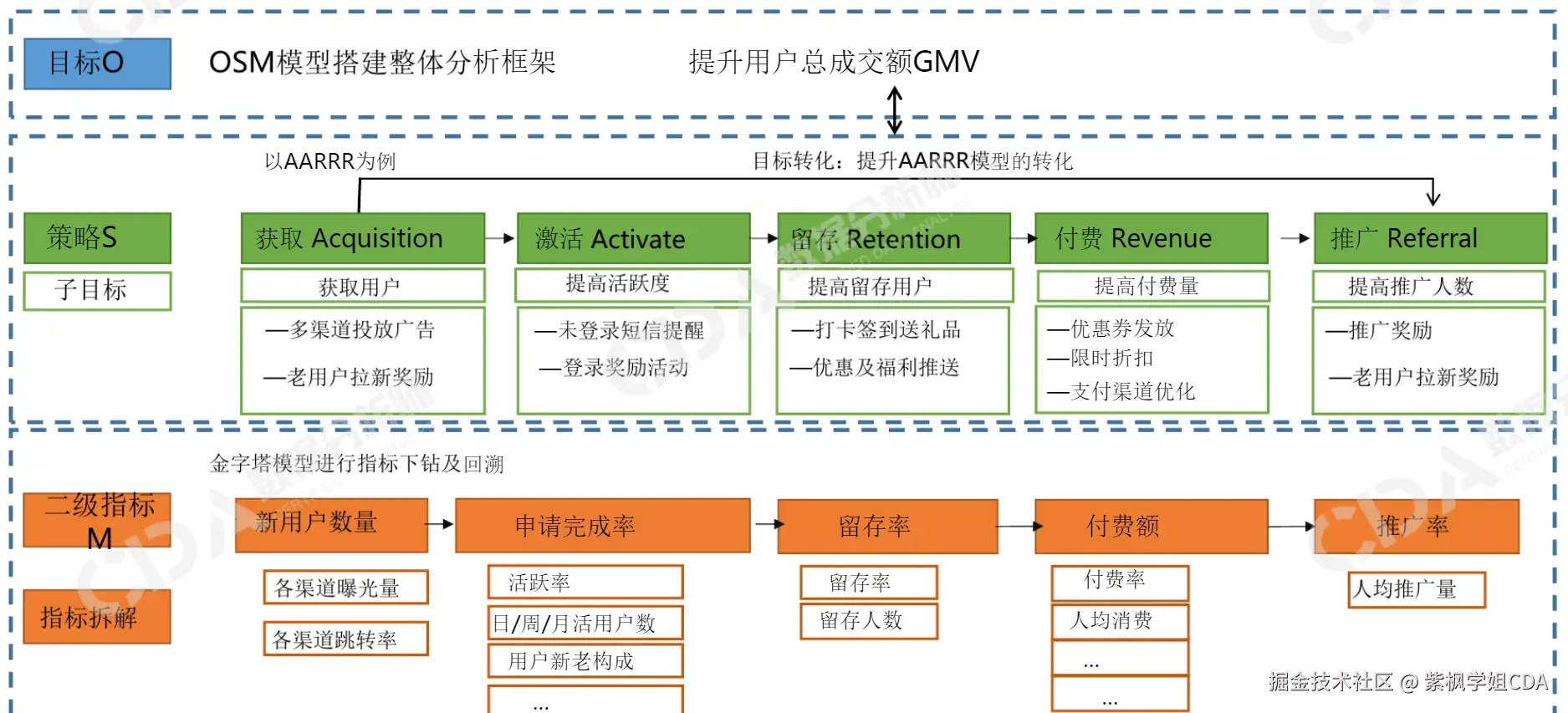 以提升GMV为例,通过AARRR模型(获客、激活、留存、付费、推广)拆解指标,逐层细化到每个业务环节的具体指标。
