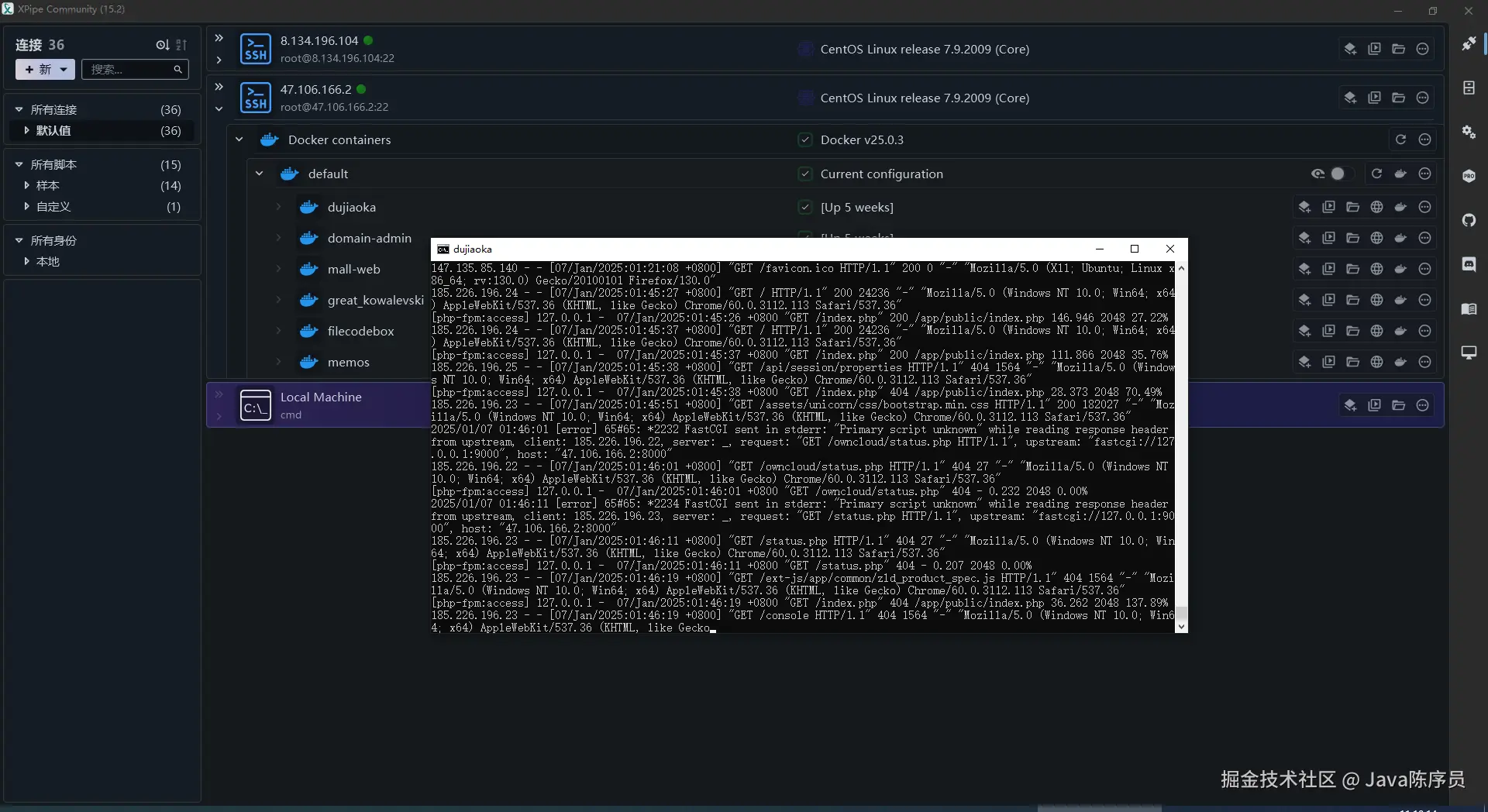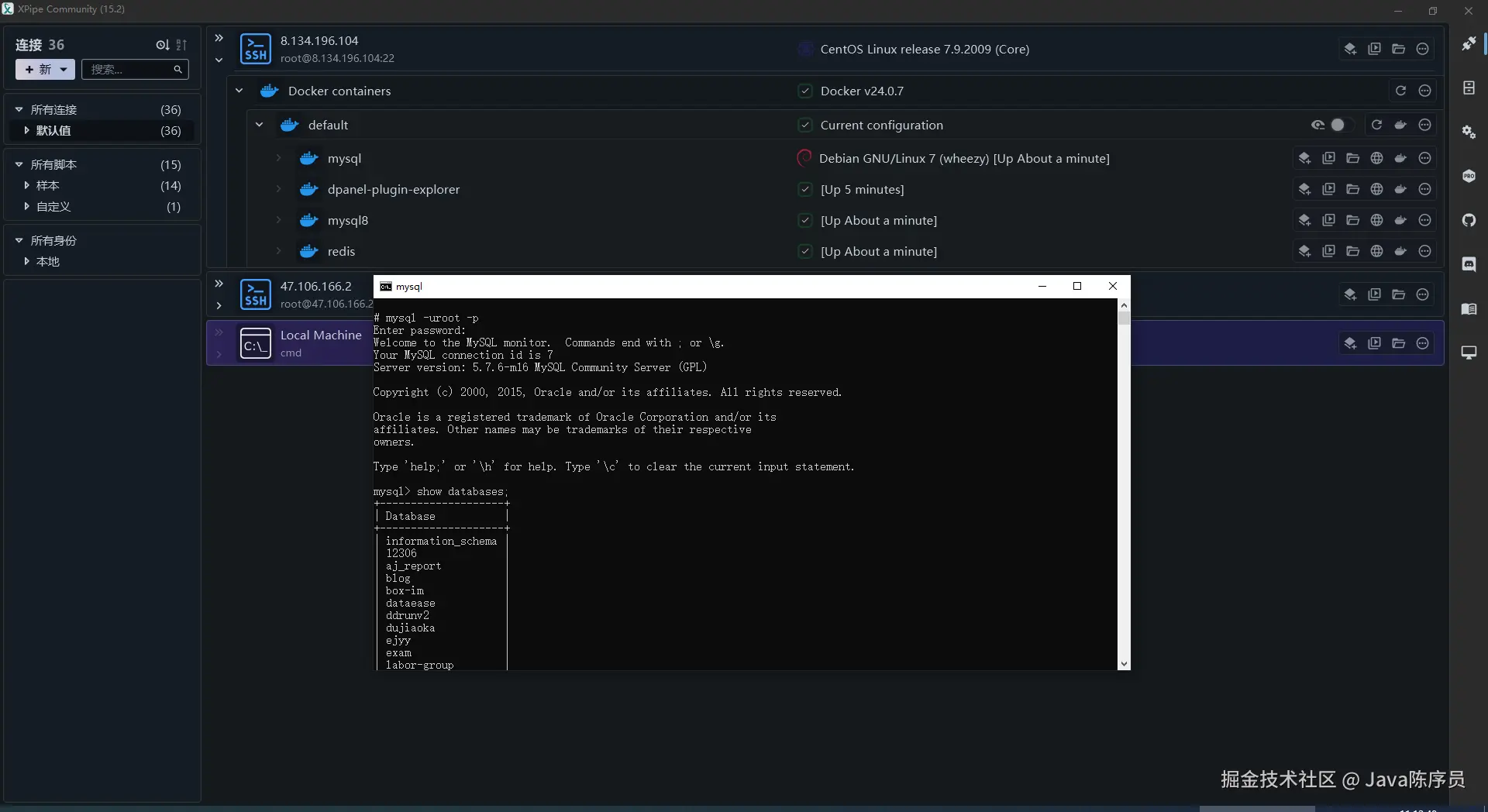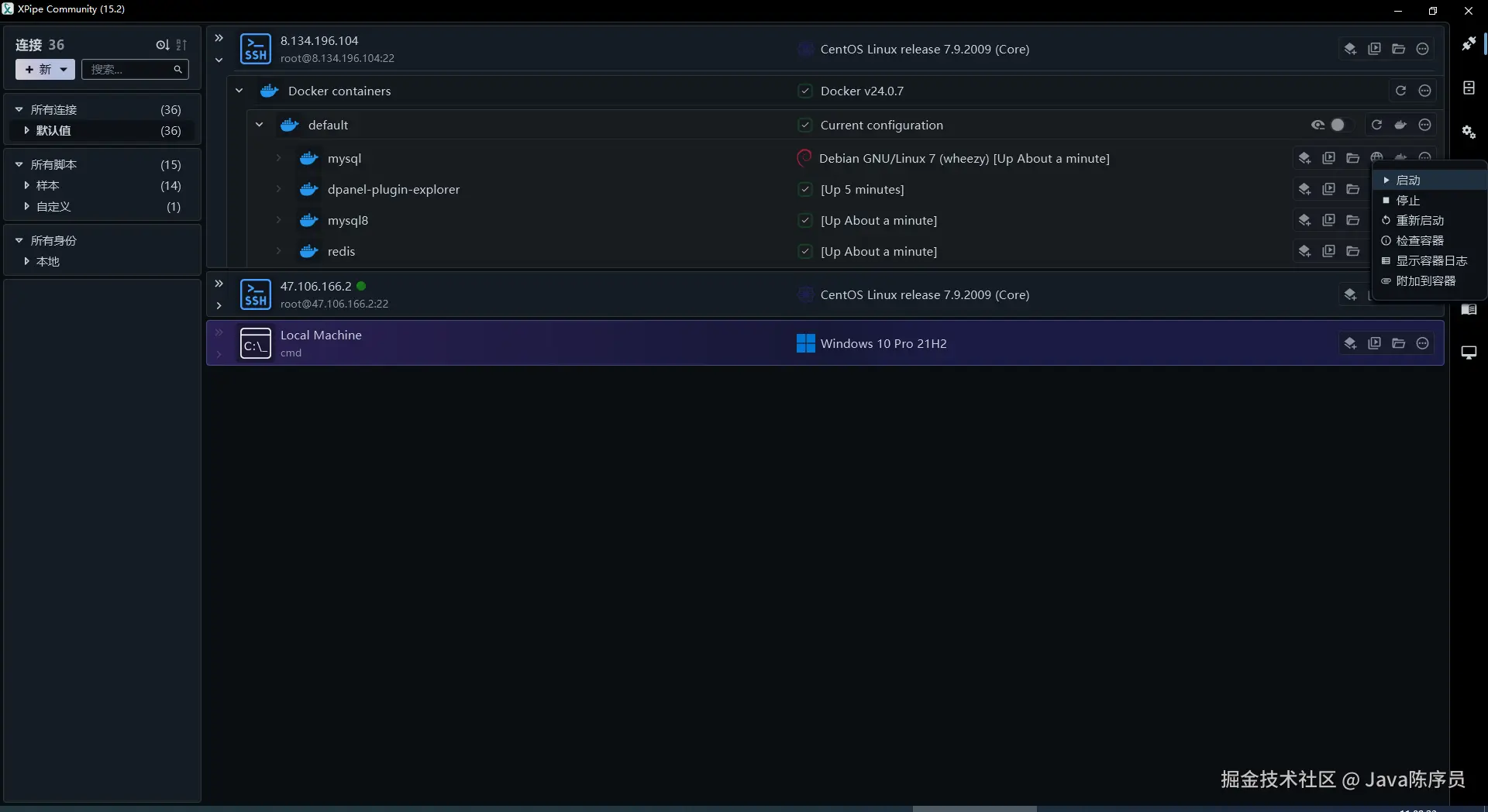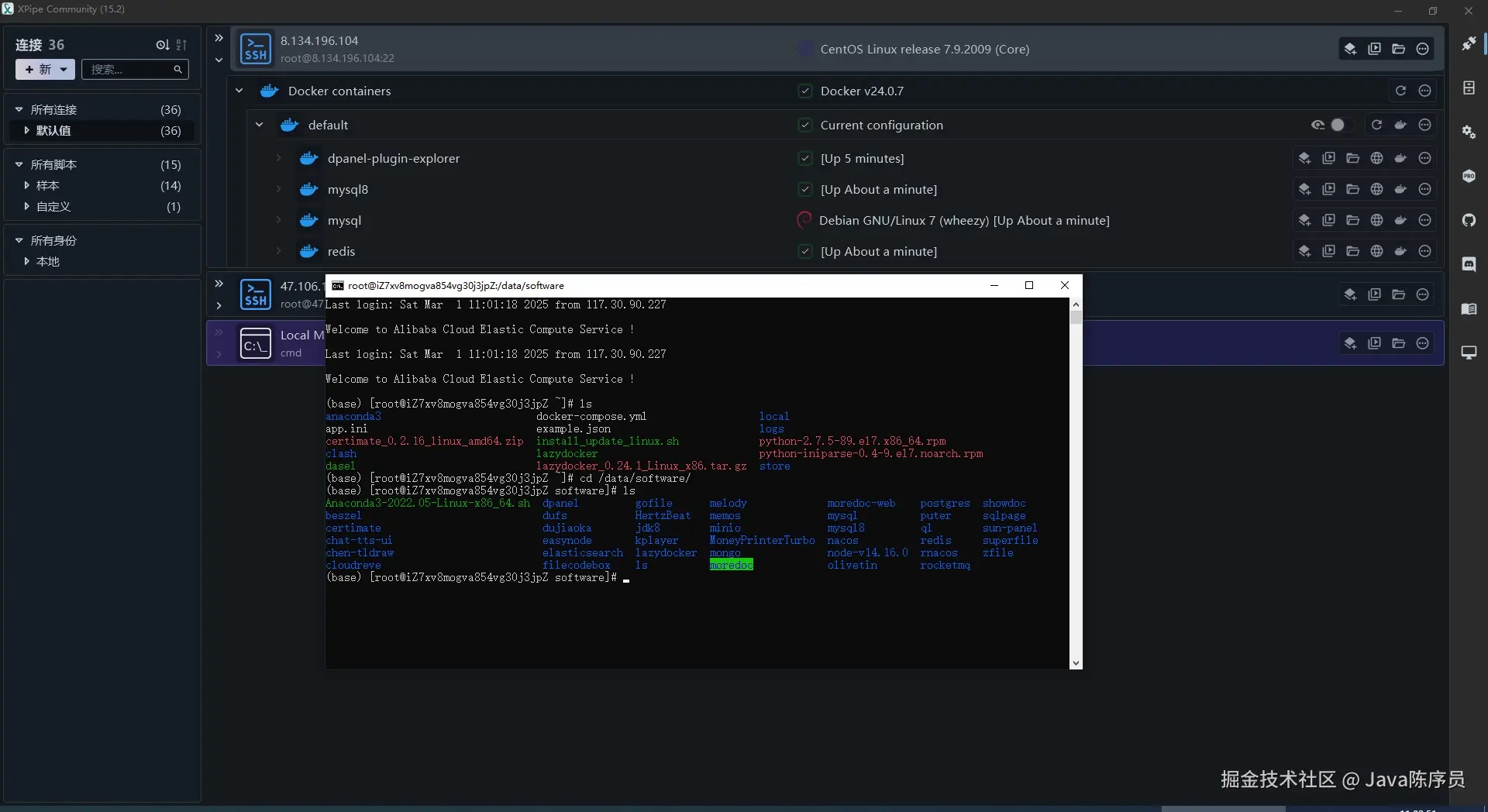 4、连接成功后,XPipe 能自动发现服务器器上的 Docker 环境并创建连接选项