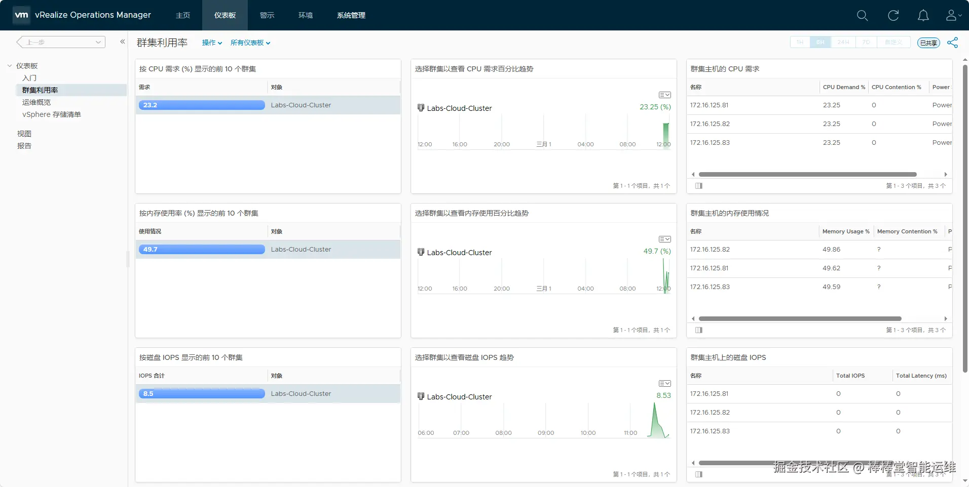 - 选择“入门”界面“容量和利用率”,单击【群集利用率】,选中“Labs-Cloud-Cluster”集群,查看CPU需求百分比趋势、内存使用百分比趋势和磁盘IOPS 趋势等指标,如图5-29所示。