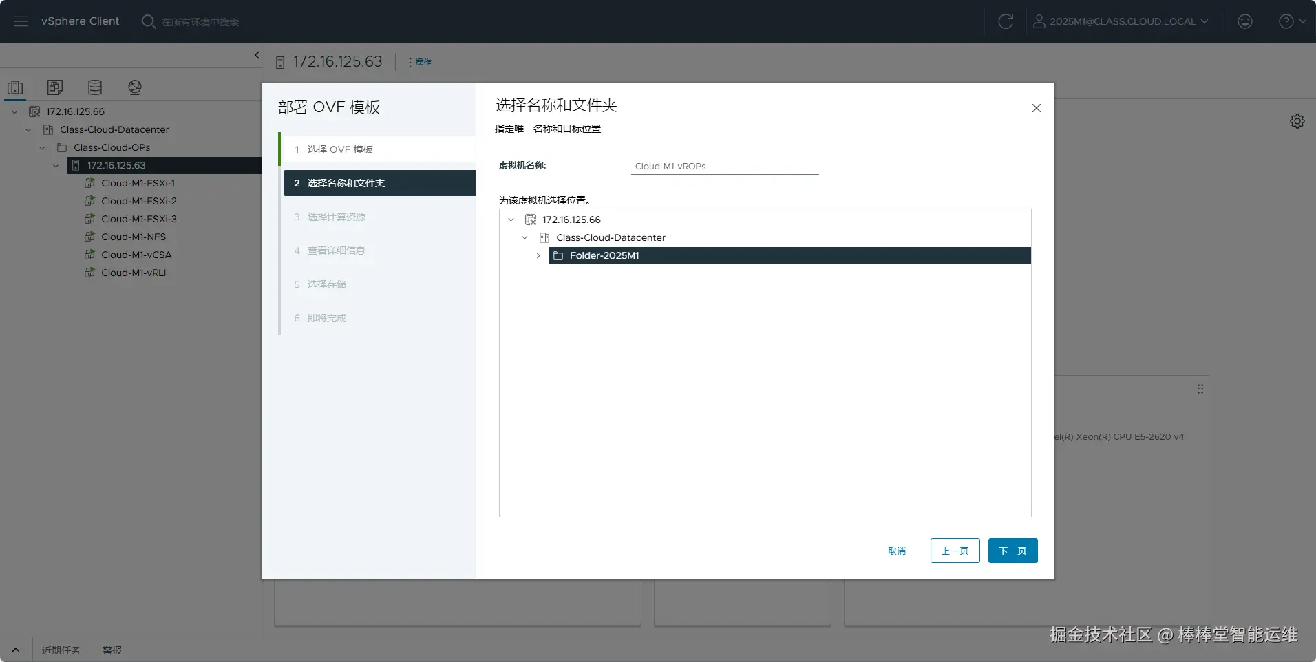 (4)在向导的“2 选择名称和文件夹”中设置虚拟机名称为“Labs-Cloud-vRealize-Operations”、选择虚拟机存放位置为“实验-学生姓名”文件夹,单击【NEXT】,如图5-2所示。