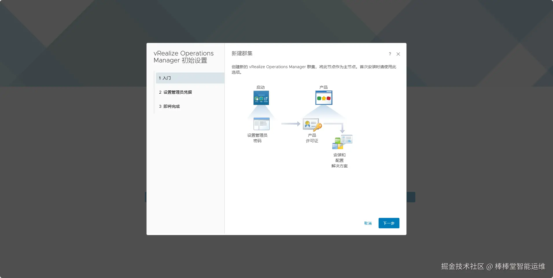 (2)进行初始设置。新建VMware Aria Operations集群,在向导“1 入门”中创建新的VRealize Operations Manager群集,将此节点作为主节点。单击【下一步】,如图5-12所示。