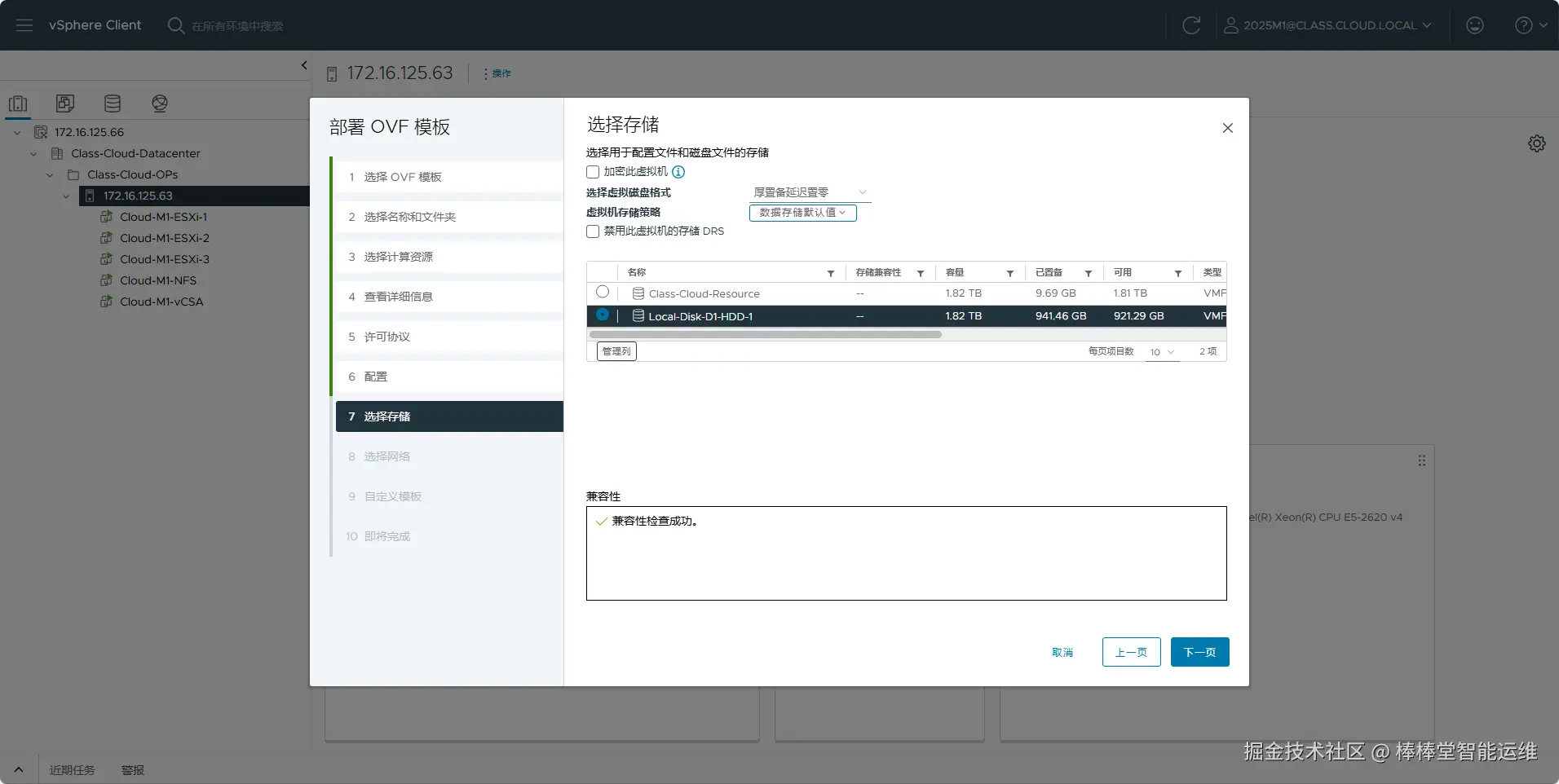 (9)在向导“7 选择存储”中选择用于配置文件和磁盘文件的存储,选择虚拟磁盘格式为“厚置备延迟置零”,选中存储为“Local-Disk-D1-HDD-1”并进行兼容性检查,单击【NEXT】,如图5-7所示。